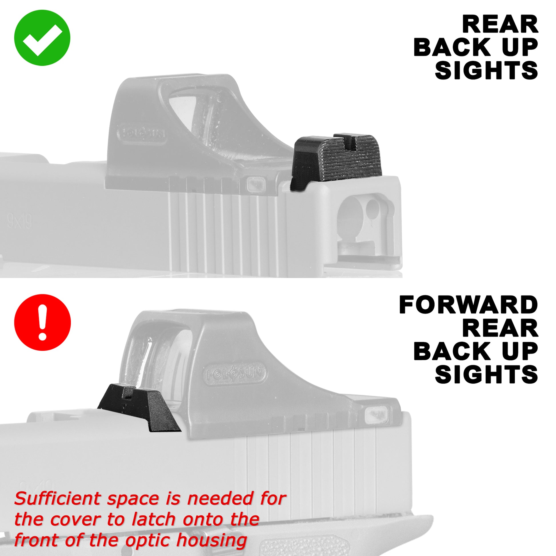 - OpticGard Covers may not be compatible with backup sights that are mounted in front of the optic. Sufficient space is needed for the cover to latch onto the front of the optic housing.